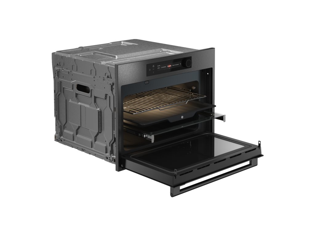 Elegantné prevedenie v tmavom brúsenom nereze so sklenenými dverami dokonale zapadne do dizajnových kuchýň.