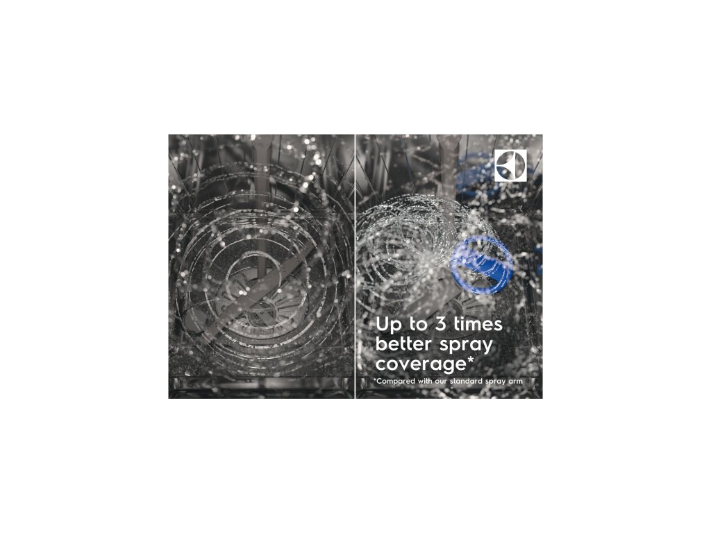 Satelitné sprchovacie rameno SatelliteClean® zanechá riad perfektne čistý a bez škvŕn. Táto technológia má až trikrát lepšie pokrytie pri sprchovaní, a to aj v prípade, že je riad naukladaný tesne pri sebe. Voda sa dostane do každého kúta aj v preplnenej umývačke.