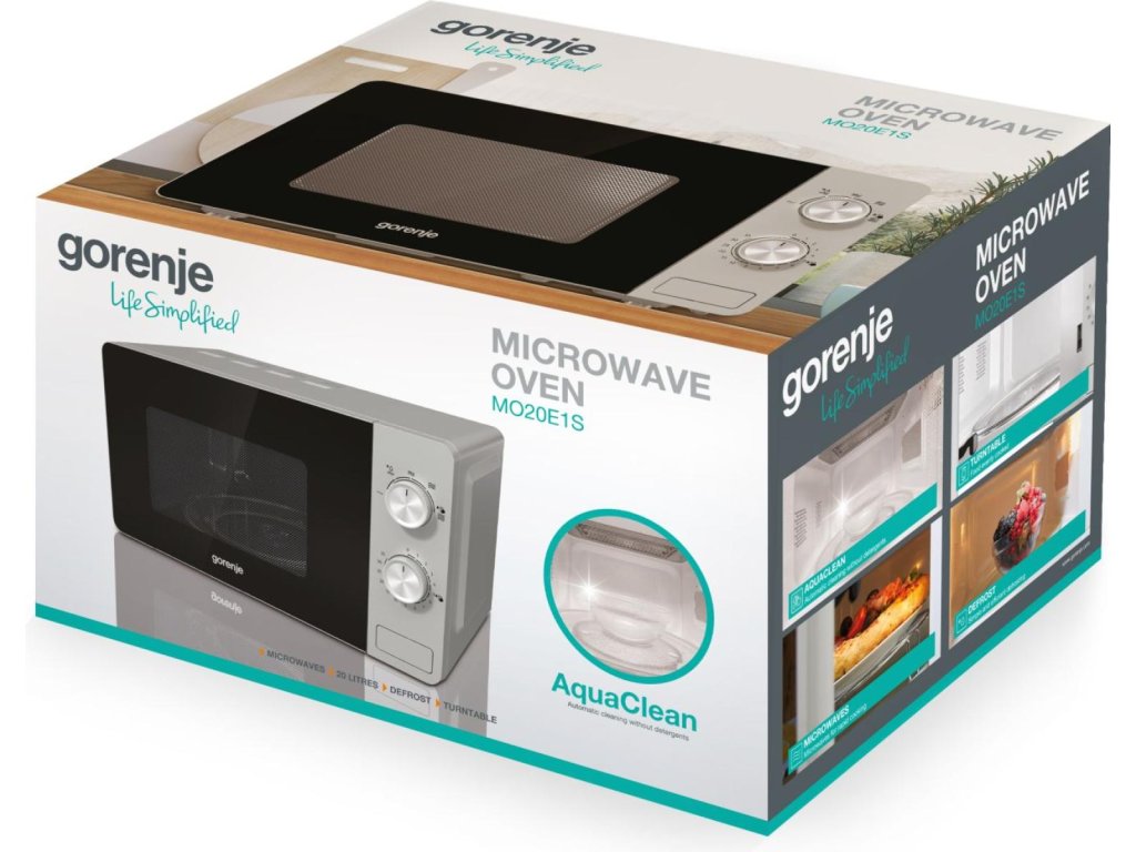 Mikrovlnná rúra GORENJE MO20E1S z radu Essential Line ponúka praktické mechanické ovládanie, výkon 800 W a kompaktné rozmery ideálne do menších kuchýň, kancelárií či na chalupu. Vďaka funkcii AquaClean je údržba rýchla a jednoduchá.